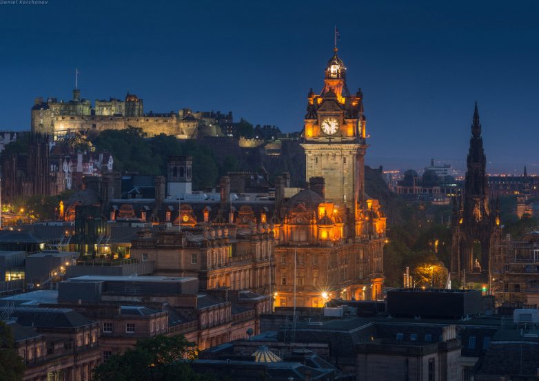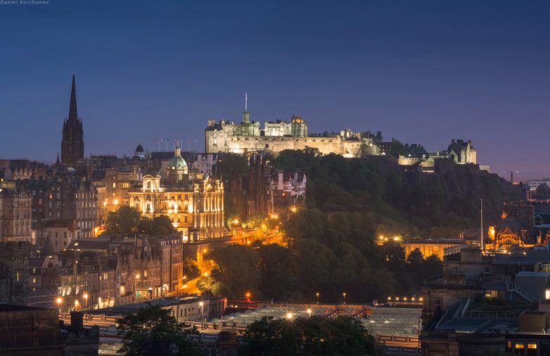 А на этой фотографии уже более компактно видны монумент и замок. Чудесное место для вечерних съёмок города! На заглавной фотографии — замок Эдинбурга днём. Это, наверное, крупнейший замок в Шотландии. Конечно, на его посещение стоит потратить практически полдня — с его стен открывается панорама на игрушечный город вдали, вплоть до моря: