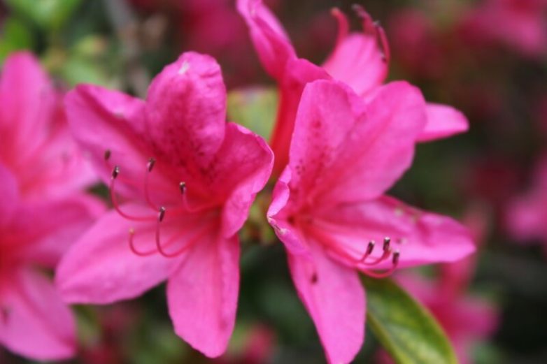 Сначала подумали, что уже зацвели пионы — и цветы, и листья похожи. Но потом увидели, что это кустарник. Может рододендрон какой-нибудь?
