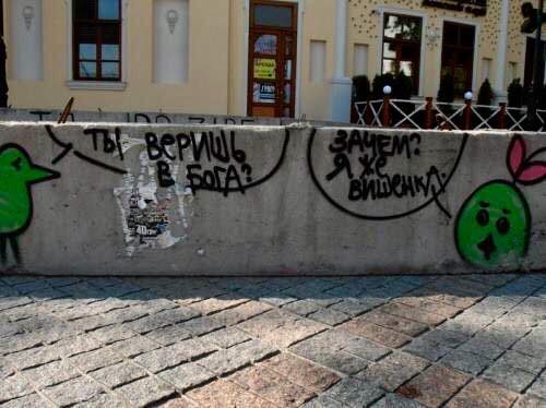 Не обходится в Северной столице и без настенных размышлений о боге и своем месте в жизни. А еще в Питере, как известно, пить, поэтому и про алкоголь уличные писатели не забыли.