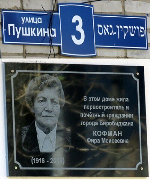 О том, что мы в еврейской автономии, напоминают таблички улиц, кое-где продублированные на идиш, и мемориальные доски — все сплошь с характерными именами и фамилиями.