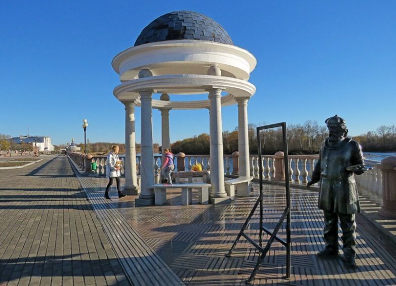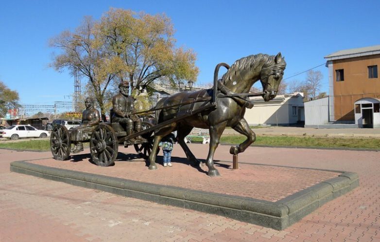 Рядом памятник первым, ещё «доеврейским» переселенцам. Доводилось слышать, что это подарок Китая и повозка едет на запад, но это миф — и скульптор тут местный, и простейшего соотнесения с Транссибом достаточно, чтобы понять — переселенцы держат путь «встречь солнцу».