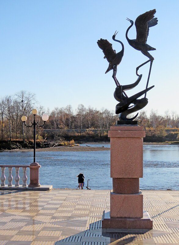 А пляшущие журавли напоминают о более древней истории этой земли — русские казаки, впервые пришедшие на Амур в 17 веке и проигравшие тогда борьбу за него, встретились здесь с народом дючеров, дальним осколком чжурчжэней, позже ушедшим на юг и ставшим частью покоривших Китай маньчжур.