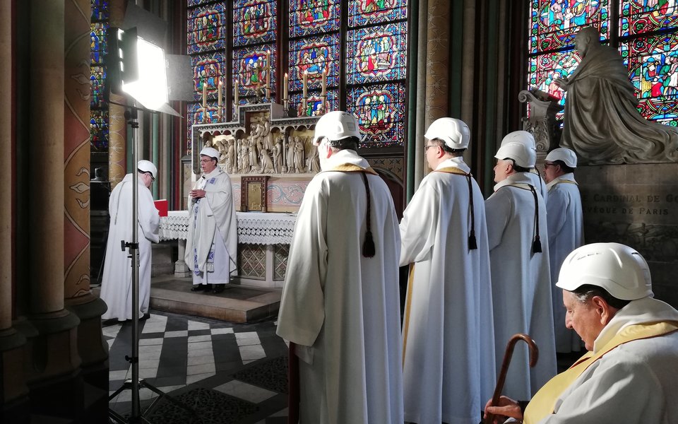 Мессу провели в небольшой часовне собора, которая не пострадала во время пожара. На богослужении присутствовали 30 человек. По соображениям безопасности все они были в белых строительных касках.