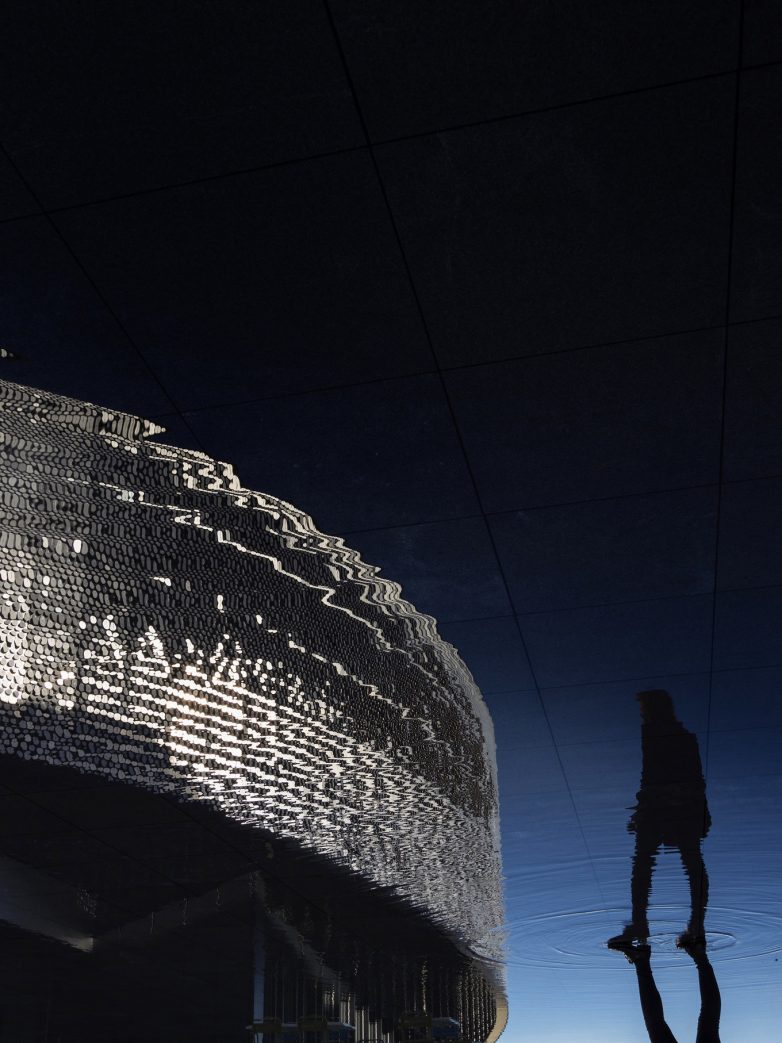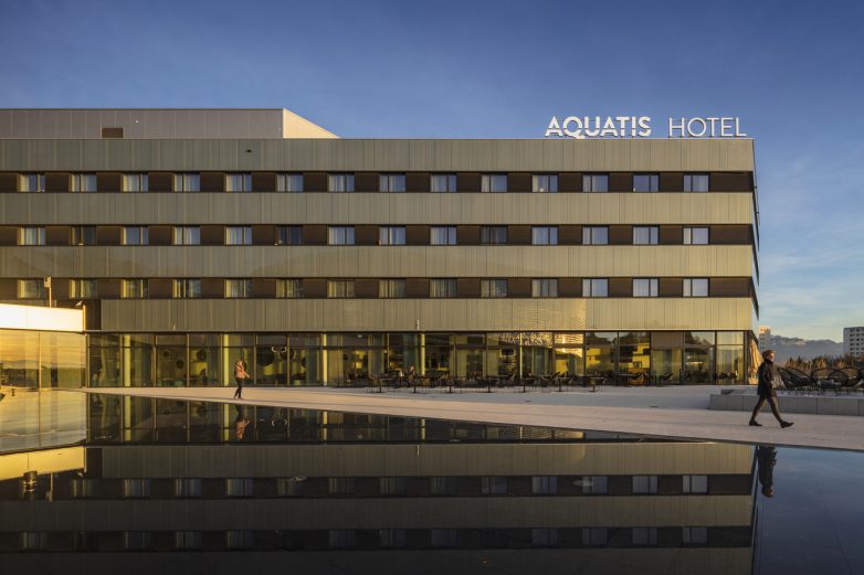В то время как стеклянные фасады отеля отражают цвета окружающей местности и капризы погоды, океанариум мерцает, когда сто тысяч подвешенных алюминиевых дисков колышет ветер, создавая эффект сияющей на солнце рыбьей чешуи или волны на поверхности воды. Между двумя зданиями спроектированы бассейны, которые участвуют в игре отражений и света.