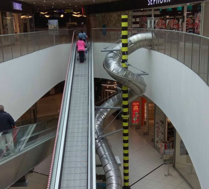 В крупном гипермаркете наряду с привычными эскалаторами установили крутые горки. Такое дизайнерское решение позволяет повысить уровень радости от шопинга и зарядить позитивом не только детей, но и взрослых.