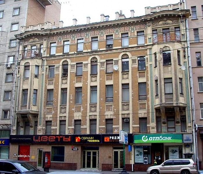 Типичный дом Серебряного века, он был построен в 1905 году и, когда его снесли, знатоки заявили о крупнейшей архитектурной утрате десятилетия — в Москве, конечно. Эксклюзивный фасад от архитектора Павла Заруцкого ещё до сноса обещали сохранить, как главное украшение улицы, но здание в итоге снесли полностью.На фасаде впервые в Москве была использована популярная в начале двадцатого века техника сграффито. В 2012 году было заявлено, что дом можно будет реконструировать, но реконструкции творение Заруцкого не дождалось. Замечательное произведение московского модерна, его фриз в стиле ар-нуво были обращены в труху.
