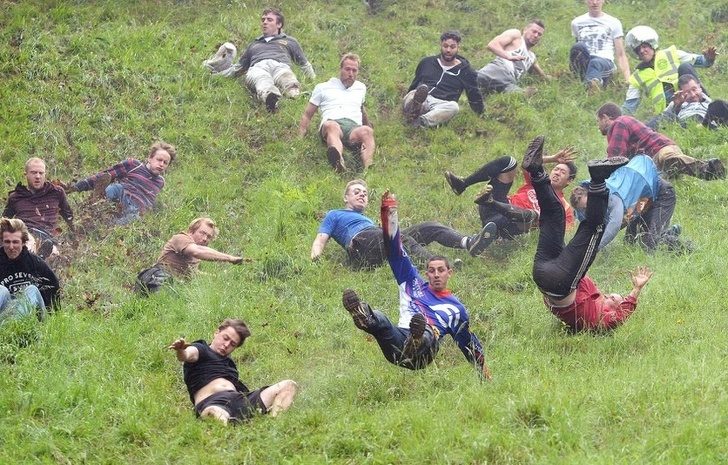 Уже сотни лет англичане проводят Куперсхилдскую сырную гонку. Каждый год в конце весны сотни зрителей собираются посмотреть на то, как 5-килограммовый круг сыра глостер запускают с крутого холма, а участники состязания бегут за ним, пытаясь поймать. Победитель получает славу и сыр. Гонку неоднократно пытались запретить, так как она небезопасна для здоровья: бывали случаи, когда соревнующиеся ломали руки, ноги и ребра, а также получали травмы шеи и спины. Но старинная традиция все еще жива.2. Чемпионат по поросячьему визгу, Франция