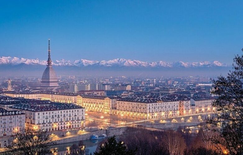 Необычное, увенчанное куполом и шпилем здание Моле-Антонеллиана появилось в Турине в XIX веке. Сегодня в нем располагается Национальный музей кинематографа, считающийся самым высоким музеем в мире. На переднем плане — площадь Витторио Венетто, а вдалеке, за границей города, виднеются Альпы.