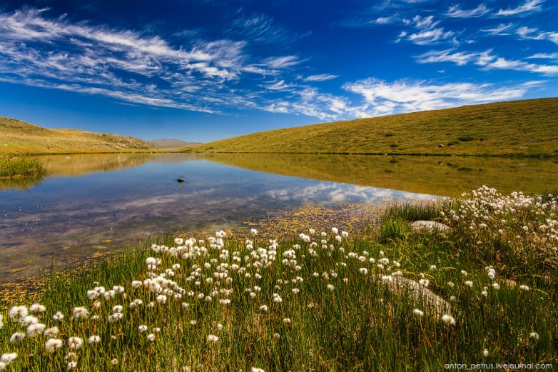 На ночлег остановились у небольшого озерца, из которого как раз и брала начало река с ледяными берегами. Тихое, спокойное место, с берегами, покрытыми пушицей. Пушицааааа!!! Обожаю это растение! Сколько фотографического потенциала у нее ) Думаю, коллеги меня поймут.
