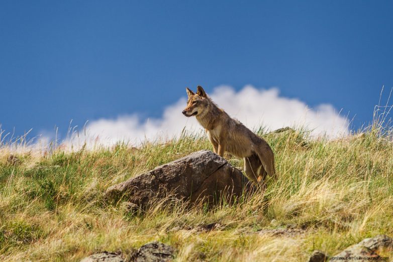 По дороге, как через грунтовку перебежал волчара. Тощий, молодой. Пока ехали, волк не обращал на нас внимания. Только остановились, как он минутку постоял — и сиганул дальше по склону. Очевидно вдогонку за пешим туристом, которого мы встретили по дороге ))