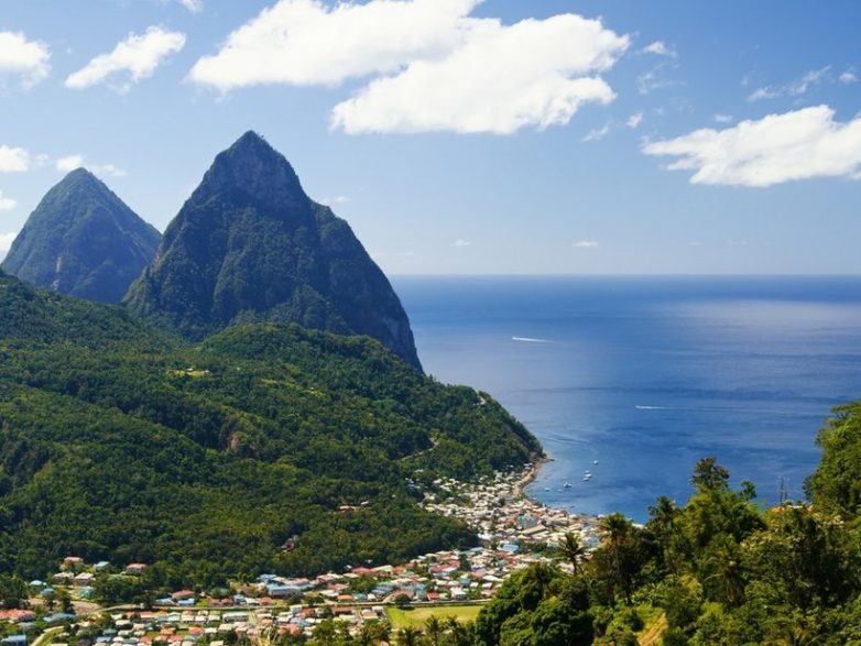 Страна-остров Сент-Люсия в Карибском море и живописные вулканы в виде конусов