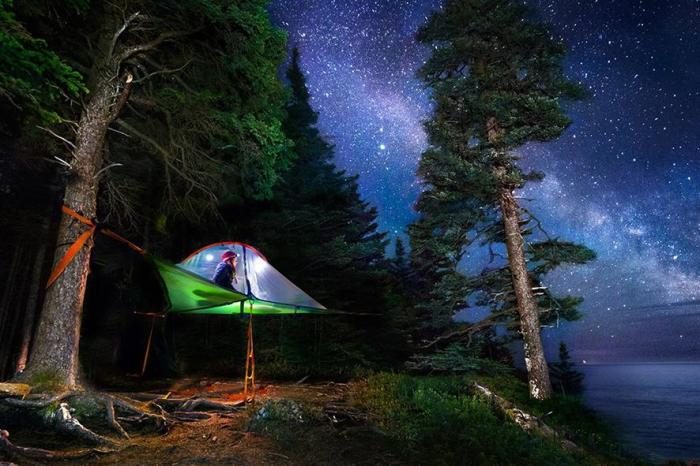 Палатка Tentsile Tree Tents раздвигает горизонты отдыха, сочетая в себе комфорт гамака с практичностью палатки и позволяя с удобством разместиться в любой среде. Она может устанавливаться на земле как обычная палатка и подвешиваться в воздухе как гамак, с использованием трех деревьев как точек опоры. Ремни снабжены системой защиты от перекручивания, поэтому внутри ничего не скатывается к центру. Палатка имеет чехол из водонепроницаемой ткани, а сетчатый экран позволяет созерцать звездное небо, будучи защищенными от насекомых. Это замечательный выбор для путешественников, ведь спать в воздухе гораздо комфортнее и романтичнее, чем на каменистой или влажной земле.