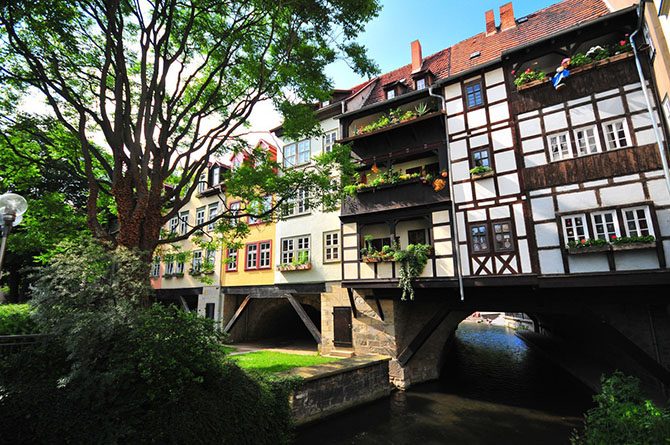 Каменный мост через один из рукавов Геры был возведен в 1325 году и являлся частью “царского” торгового пути. Изначально сооружение было деревянным и постоянно страдало от пожаров. В настоящее время на нем располагаются 32 жилых фахверковых дома и различные магазины.