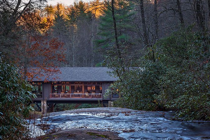 Частный дом, спроектированный бюро Platt Architecture. Две основные части здания соединены переходом через горный ручей. Опоры выполнены из камня и металлических конструкций, поэтому разлив ручья или его замерзание владельцам не страшны.