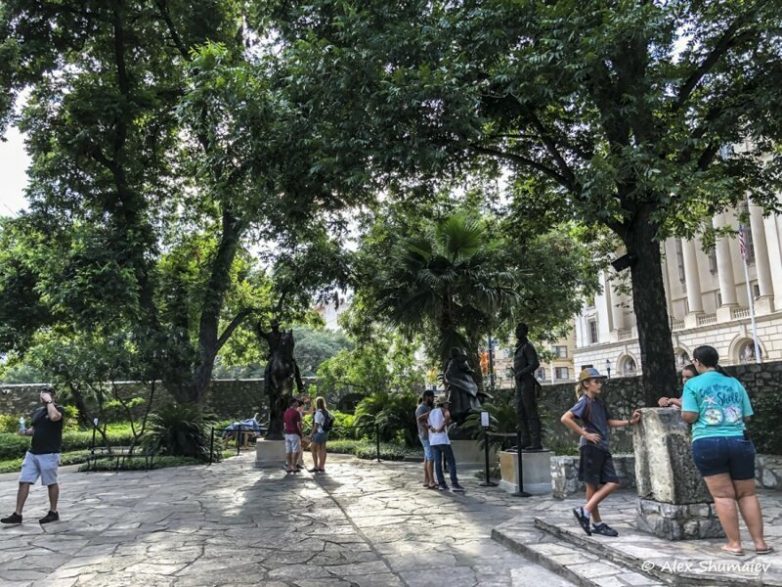 Побуду немного занудой, историческая миссия Аламо находилась перед нынешним входом, по сути, весь форт был на территории Аламо Плаза, то же, что восстановлено сейчас — это реплика, которая сдвинута немного на восток. Реальными осталась сама церковь и бараки слева от нее.