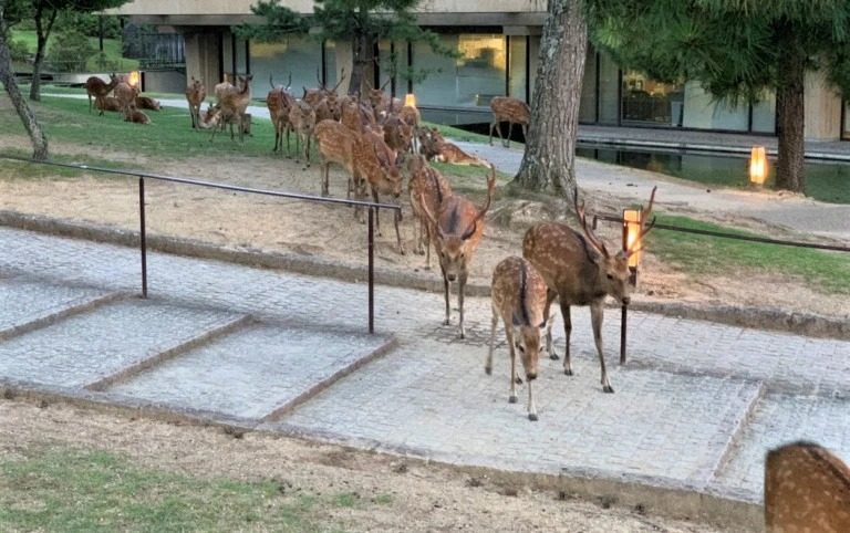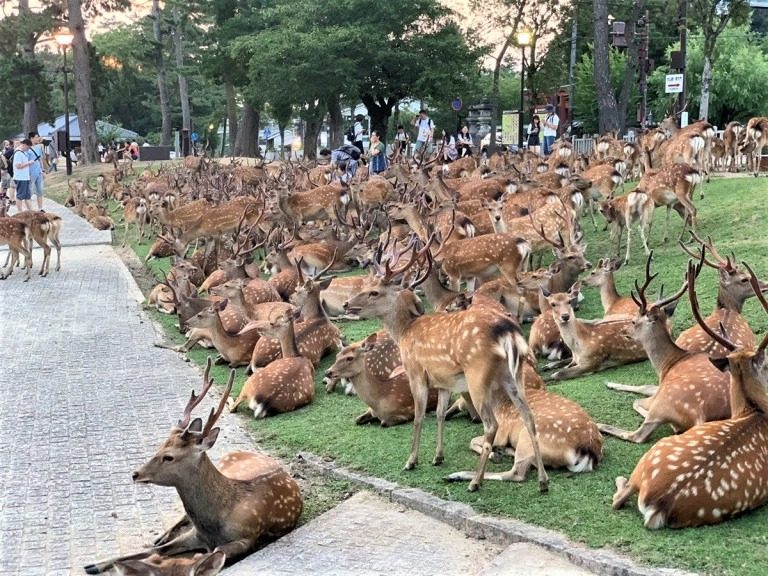 В 2019 году оленей стало больше обычного. Каждый вечер, около 18:30, животные приходят со всех уголков парка Нара и садятся на определенном месте — напротив Национального музея города Нара, расположенного в парке.