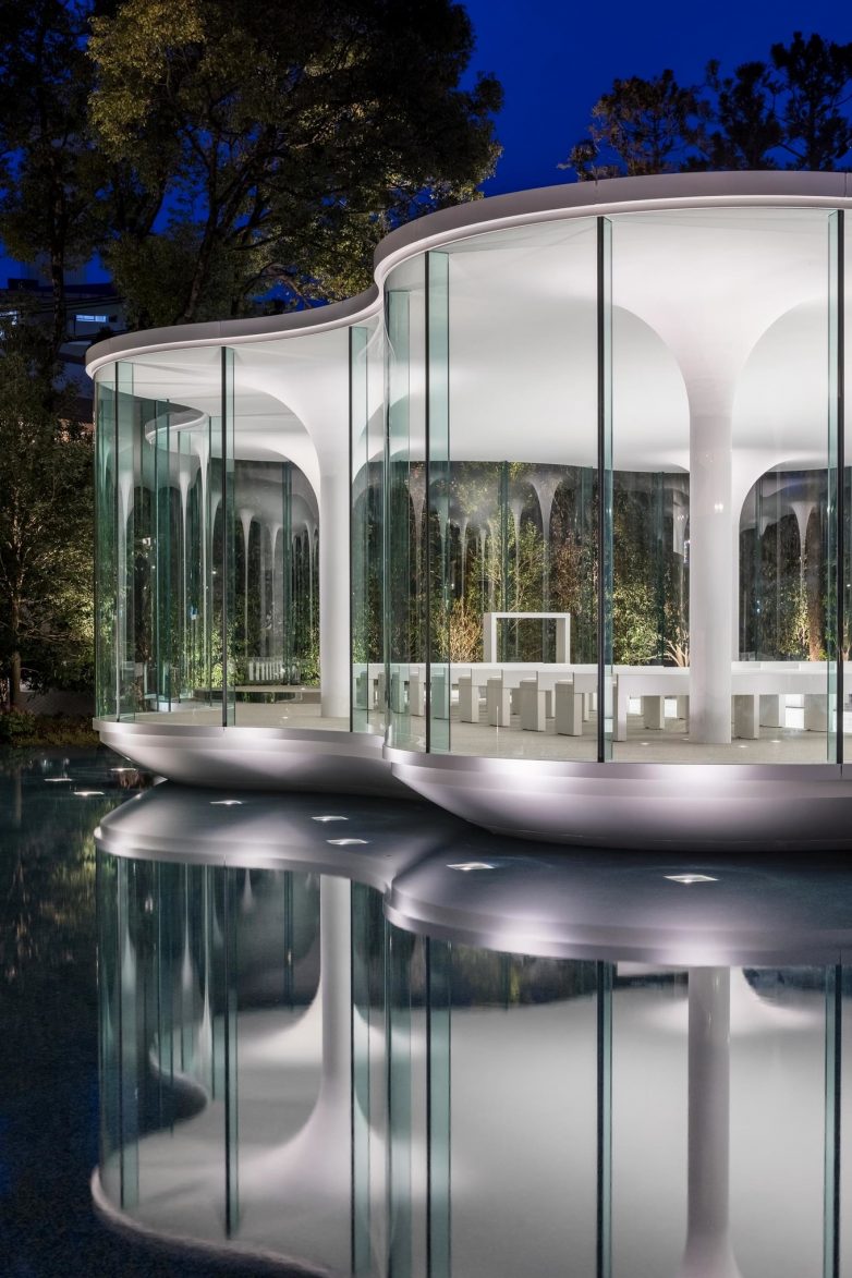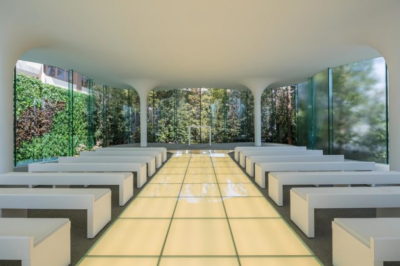 Минималистичный потолок, свободный от любых технических деталей и оборудования, опирается на круглые колонны. Стеклянный пол с подсветкой ведёт к минималистичному алтарю. Капелла выходит в сад и имеет доступ к водоёму, ограничиваясь зелёной противопожарной стеной, изолирующей её от главного здания церемониального зала. Водная поверхность отражает конструкцию, добавляя ей ещё больше лёгкости и расширяя мечты в другие измерения.