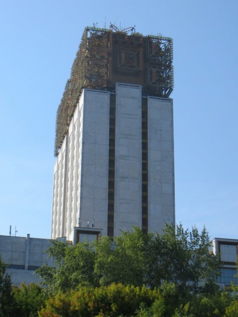Уже в этом веке появилась новая высотная доминанта — Дом на Мосфильмовской. Его высота — 213 метров, 54 этажа. Хотели построить ещё выше, но это противоречило разрешению. Вроде даже пришлось несколько этажей сносить. Архитектор — Сергей Скуратов. Не знаю, как вблизи, а издалека здание выглядит лёгким, воздушным.