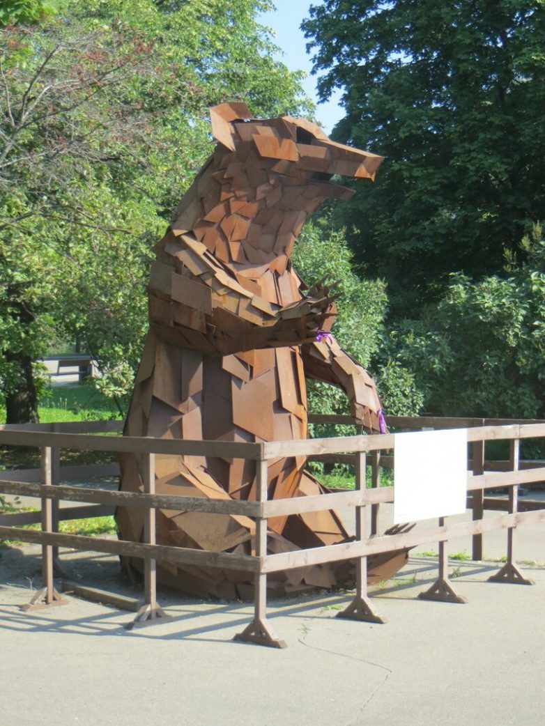 Скульптура бурого медведя была создана в 2016 году известным венгерским скульптором Габором Миклошом Соке. Символом весны было решено сделать бурого мишку, которому в марте уже пора выходить из зимней спячки. По задумке автора чтобы приблизить наступление весеннего тепла, люди выманили сонного медвежонка, разбудив его ото сна. Скульптура изготовлена из кортеновской стали, окисная плёнка стальных пластин не размывается водой, поэтому, раз заржавев, она навсегда сохраняет свой благородно коричневатый цвет. До 2016-го медведь сидел в парке Горького, но потом решили людей не пугать и перевезли сюда, здесь меньше народа ходит.