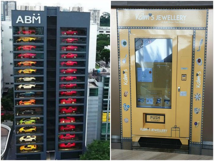 В Сингапуре очень развита автоматизированная торговля. В автоматах можно купить любую еду, начиная от фаст-фуда и заканчивая свежим лососем или мясом. Наряду с обычными автоматами, торгующими едой, есть и более интересные экземпляры, предназначенные для богачей. Например, в крупных городах есть автоматы, где в пару кликов можно купить ювелирное изделие или авто. Стоит отметить, что автомат по продаже авто выглядит поистине впечатляюще. Он представляет собой высокое здание с окошками, в каждом из которых стоит по автомобилю.