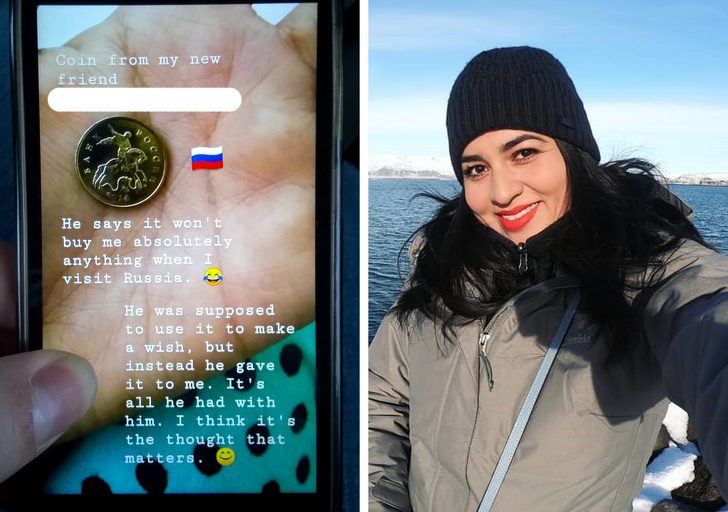 «Монетка от моего нового друга. Он сказал, что я ничего не смогу на нее купить, когда буду в России. Он хотел ее использовать, чтобы загадать желание, но вместо этого отдал мне. Это все, что у него было с собой. Я думаю, что самое главное — это внимание».Как-то раз я ехал в автобусе с очень обаятельной мексиканкой, мы разговорились, обменялись контактами. Мне захотелось подарить ей что-то на память, а в кошельке у меня было только 50 копеек. Я сказал, что это монетка на удачу. Она так обрадовалась и удивилась, что даже в своем инстаграме решила написать про этот «щедрый» подарок. Вот на что способны 50 копеек за тысячи километров от России.