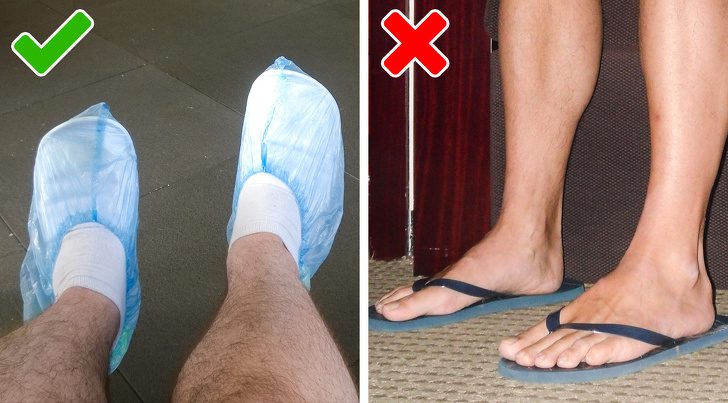 Чтобы не возить с собой мокрые и тяжелые шлепки, можно взять несколько пар бахил. В них удобно принять душ и не жалко сразу выбросить. Еще бахилы можно использовать как носки, если вы промочили обувь (как экстренный вариант на пару часов ходьбы по лужам).