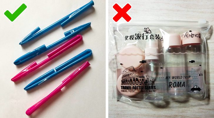 Поэтому перед путешествием проверьте общий объем всех необходимых вам косметических средств. Чтобы не брать с собой десятки баночек и скляночек, вы можете наполнить коктейльные трубочки необходимым количеством крема и заклеить с 2 сторон скотчем. А в поездке их можно использовать как тюбики с зубной пастой, выдавливая необходимое количество. Чтобы не запутаться в своем арсенале, на каждой трубочке (лучше брать разноцветные) маркером можно подписать название содержимого.