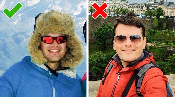 При выборе солнечных очков отдавайте предпочтение не красоте оправы, а высокому уровню защиты от солнца. Лучше приобрести этот полезный аксессуар со степенью защиты UV 400 или s4. Очки вам пригодятся даже зимой, так как солнце сильно отражается от снега, и ваши глаза это сразу почувствуют. В крайнем случае возьмите 2 пары: одни красивые, для фотографий, а другие менее гламурные, но с высокой степенью защиты от УФ-лучей.