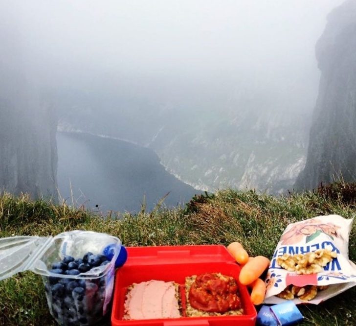 Помимо школы, садика и работы можно спокойно открыть коробку в автобусе или поезде и перекусить. Так делают очень многие люди. Отправляясь в пеший поход, просто необходимо взять с собой такую коробочку. У норвежцев есть ритуал: покорив очередную гору, они садятся, открывают коробки с едой и едят, любуясь видом.