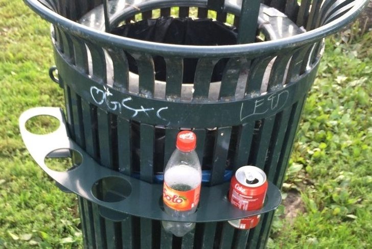 За сдачу бутылок и банок на переработку можно выручить деньги. На мусорных баках есть специальные держатели, чтобы людям не нужно было искать их среди мусора.