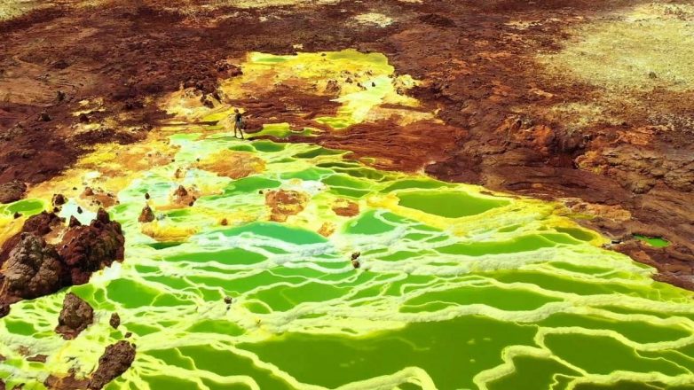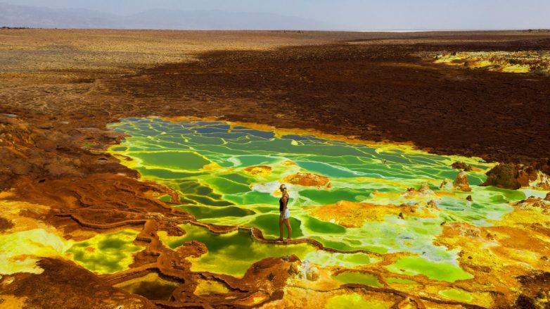Серные озера в пустыне Данакиль в Эфиопии хоть и выглядят потрясающе красиво, но именно они обеспечивают полное отсутствие жизни в долине. Данакиль является одним из самых низких и горячих мест на планете Земля, и она испещрена потусторонними серными водоемами. И именно по этому опасному и негостеприимному месту рискнула прогуляться 25-летняя путешественница Бриджит Тэквей. Снимки получилось что надо.