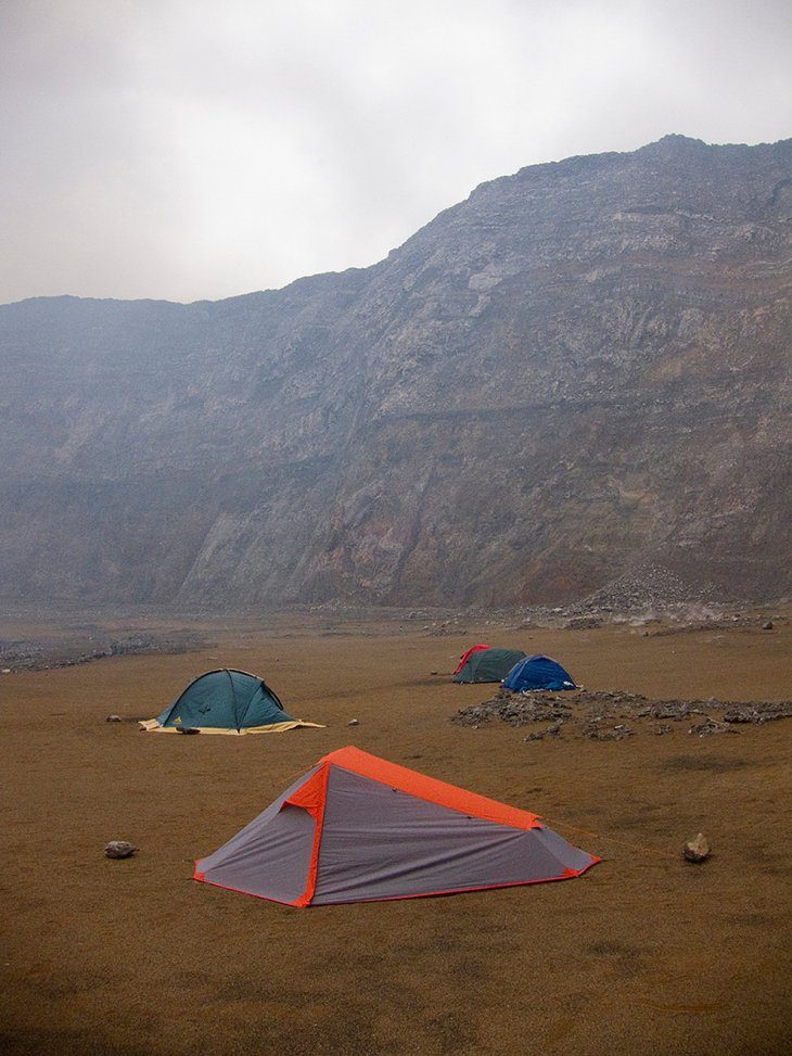 Вулканические газы около лагеря экспедиции. Часто приходилось спать в защитных масках. (Фото Olivier Grunewal):