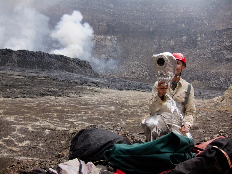 Ученый собирает газ в нижней части кратера. (Фото Olivier Grunewal):