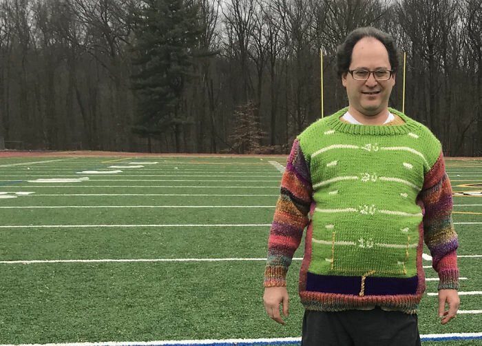 Сэм вяжет свои уникальные свитера уже в течение 20 лет. На них он изображает узнаваемые места и достопримечательности — от Стоунхенджа до Тауэрского моста в Лондоне и Ниагарского водопада. Затем он посещает эти места, обязательно фотографируясь на фоне того, что и изображено на его свитере. Это нужно видеть:
