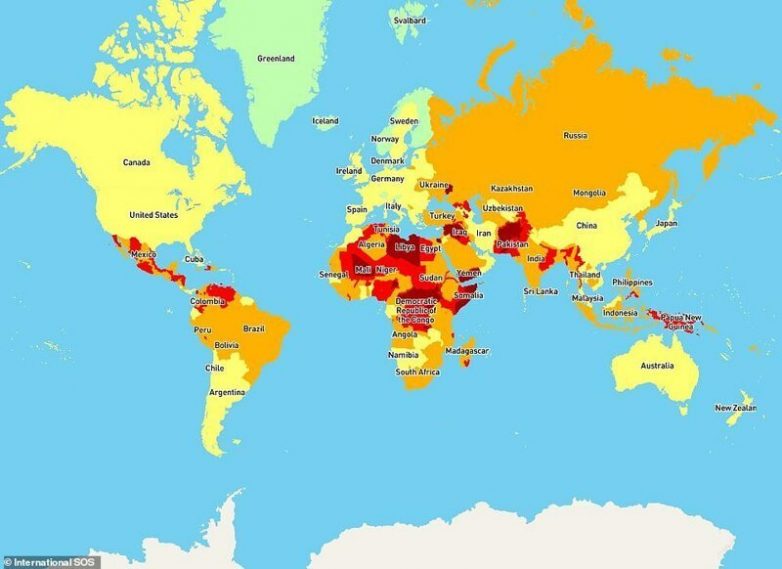 Страны отмечены по нарастанию опасности: зеленый — незначительный уровень опасности, желтый — низкий уровень опасности, оранжевый — средний уровень, красный — высокий уровень, бордовый — критический уровень опасности.