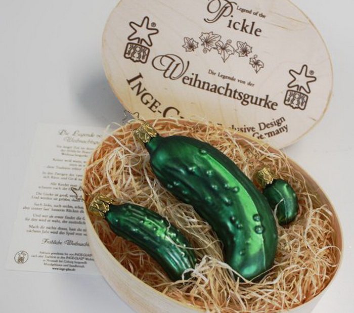 В США этот обычай считается пришедшим из Германии, но немцы, если и знают о рождественском огурце, то скорее из рассказов об американских праздничных традициях. Речь, конечно, уже идет не о настоящем овоще: на елке прячут украшение в виде огурца. А продавцы таких елочных игрушек часто снабжают их упаковками с рассказом о старинном немецком обычае. Якобы когда-то давно в Германии было принято развешивать на рождественском дереве яблоки – как символа изобилия. Но в один из неурожайных годов яблок не нашлось, и тогда находчивые немцы украсили елку солеными огурцами.
