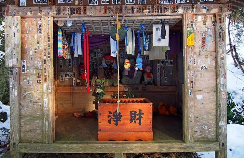 Статуя в красном фартучке — Дзизо, очень почитаемый Бодхисаттва. Покровитель путешественников, пожарных и беременных, а также защитник умерших детей, считается, что он оберегает их души от демонов.