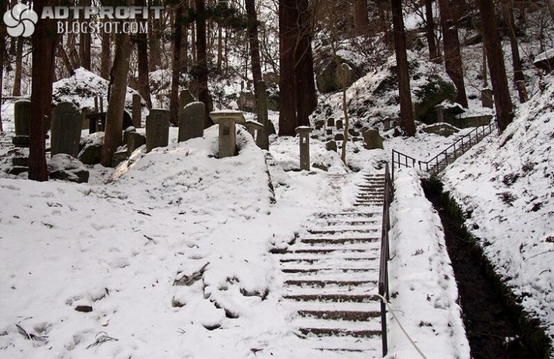 Ступенька за ступенькой я начала подъем. Лестница запорошена снегом, но пока все нормально. Дорога проходит между могучих кедров, каменных фонарей и маленьких статуй Дзизо. Начало мне нравится.
