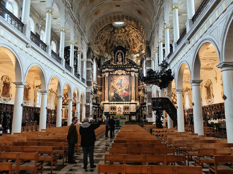 Интерьер, большая часть которого была первоначально разработана Рубенсом, включает в себя монументальную кафедру, которая расположена в середине нефа. Восемь конфессиональных ящиков встроены в панели боковых стен. Барочная церковь также включает в себя несколько скульптур с резьбой по дереву.