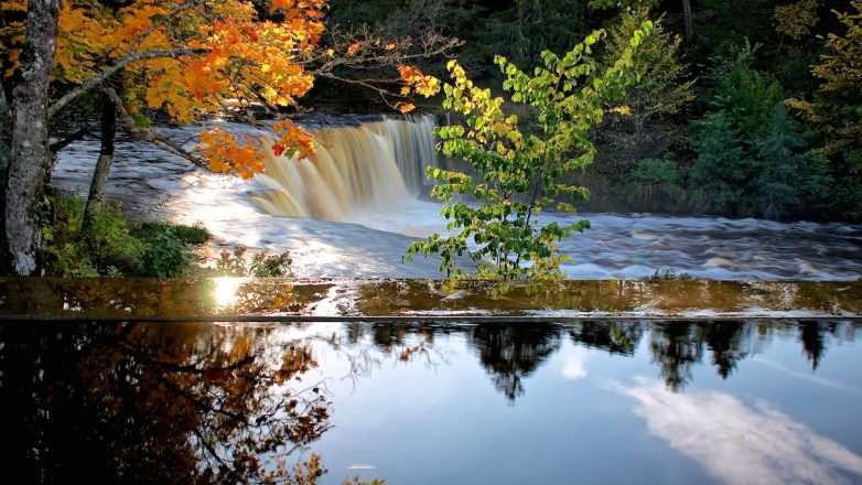 Водопад окружает ухоженный парк.