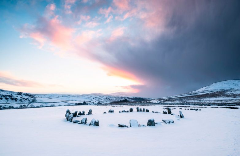 Английский кромлех Свинсайд. Кро́млех — древнее сооружение, как правило, позднего неолита или раннего бронзового века, представляющее собой несколько поставленных вертикально в землю продолговатых камней, образующих одну или несколько концентрических окружностей. Назначение кромлехов не всегда до конца ясно. Среди известных применений — ритуальное ограждение священного пространства с образованием «храма под открытым небом»: