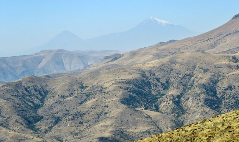 А вот такой вид на Арарат открывается с хребтов к югу от долины, отделяющих от неё следующий регион Вайоц-Дзор. Здесь из силуэта двух вершин пропадает то особое изящество: