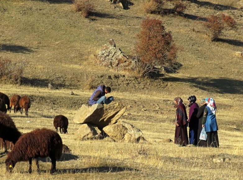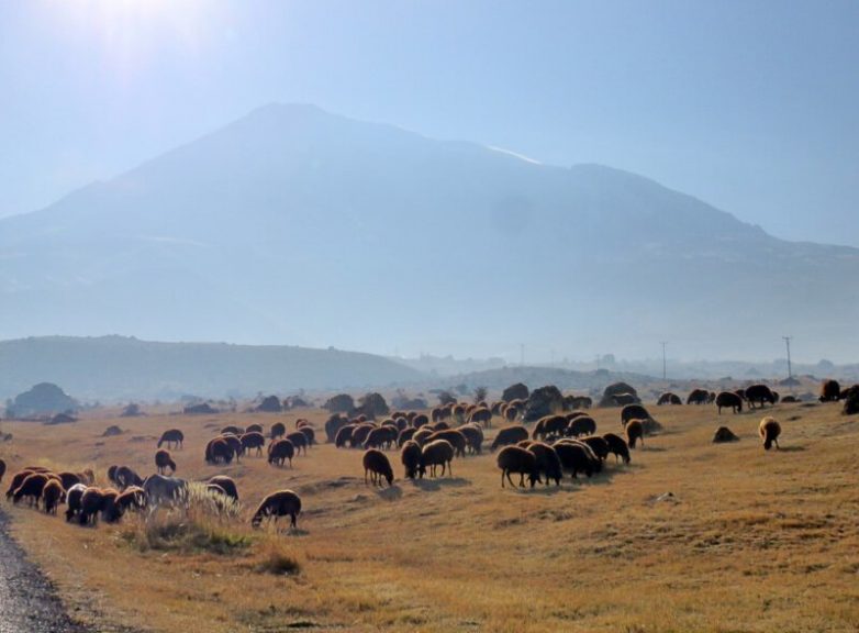 Мы же доехали в Аралик, оказавшийся маленьким, грязным и каким-то очень постсоветским по духу райцентром. Бойкий дедушка в маршрутке, узнав, что мы хотим в Енидоган, оживился и повёл нас с каким-то людям, которые нас отвезут. Этими людьми оказались таксисты, а такси в Турции неимоверно дорогое — что-то вроде 10 лир (100 рублей) за километр, коих до цели выходило ещё 17. Поэтому мы выбрались на трассу да нашли начало асфальтовой дороги, вид которой, как и под Корганом, ничего не сулил. У поворота какие-то чабаны, лицами и одеждой не отличимые от своих коллег в Средней Азии, пили чай из турецких вогнутых стаканов-«бардаков». Конечно же, позвали они и нас, и один, узнав, что мы из России, даже сумел вспомнить пару слов по-русски. Дальше они хотели предложить нам ракии, но тут внезапно на глухую дорогу свернула машина. И вот мы снова катили к горе, и мимо мелькали уже не поля застывшей лавы, но столь же сюрреалистические россыпи гигантских валунов: