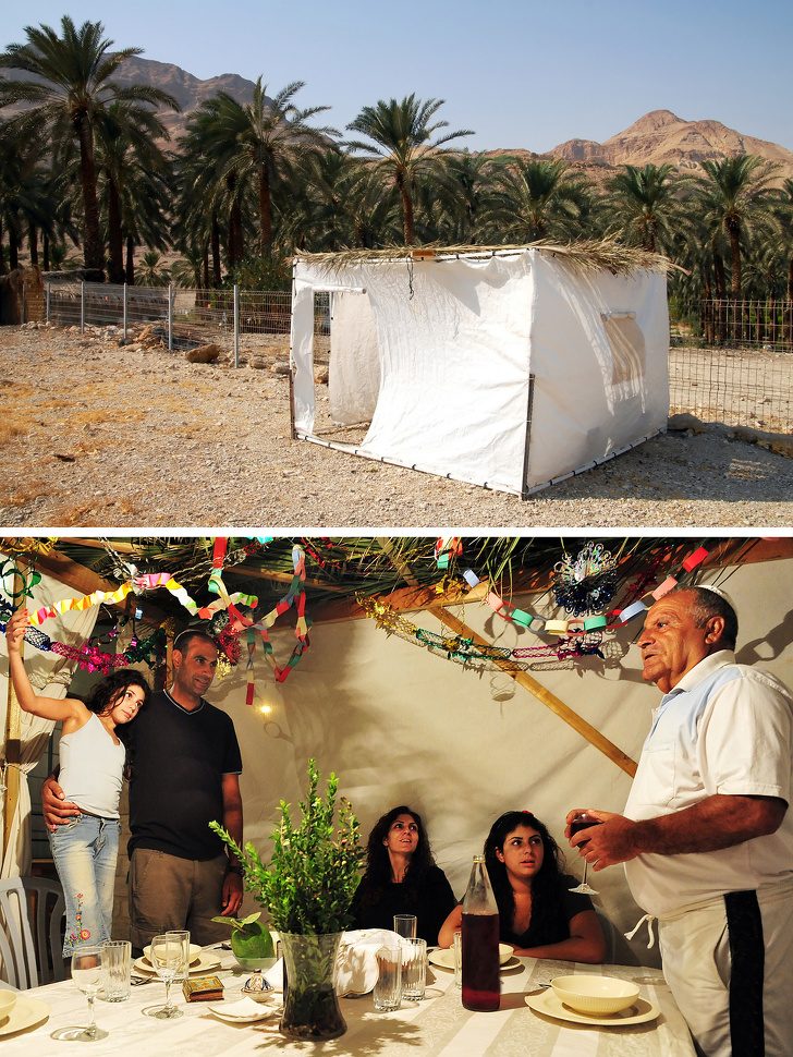 Во время праздника Суккот израильтяне покидают свои уютные квартиры и обустраивают шалаши c пальмовыми крышами, называемые суккáми. В этих шалашах местные жители устраивают посиделки, а если везет с погодой, еще и ночуют. Эта традиция укоренилась как дань памяти евреям, блуждавшим по Синайской пустыне.