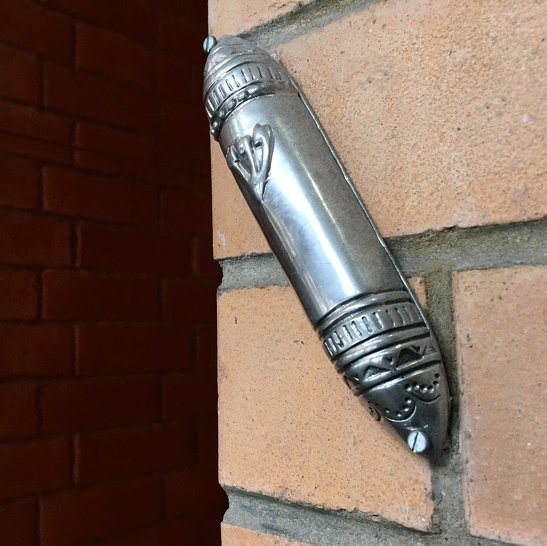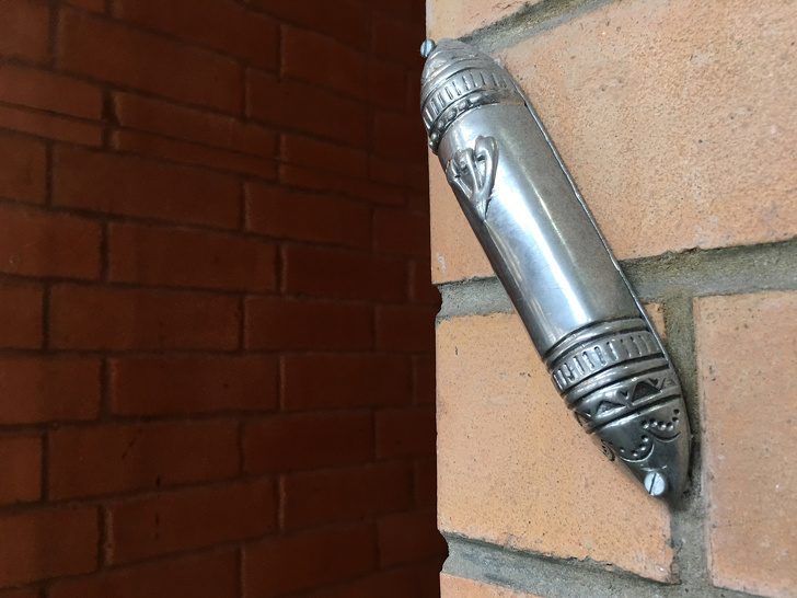 Он называется мезуза. В нем прячут свиток со словами из Торы. Мезуза вешается на внешний косяк входной двери, и верующие израильтяне целуют его при входе и выходе из дома. Поцелуй выполняется чисто механически: человек прикладывает к мезузе два пальца, а затем подносит их к губам.