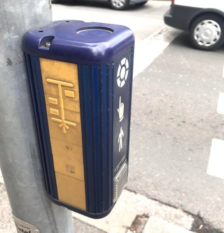 На этой кнопке светофора есть план дороги для слепых людей