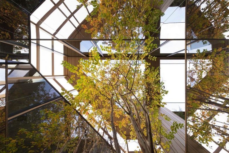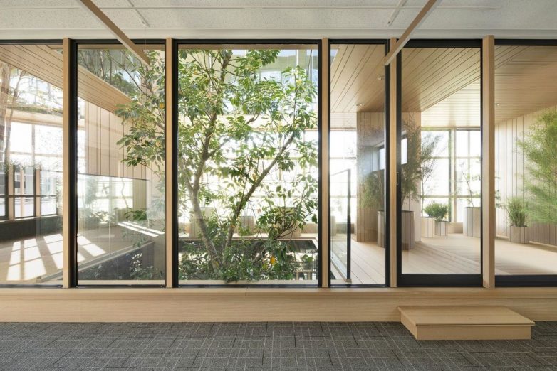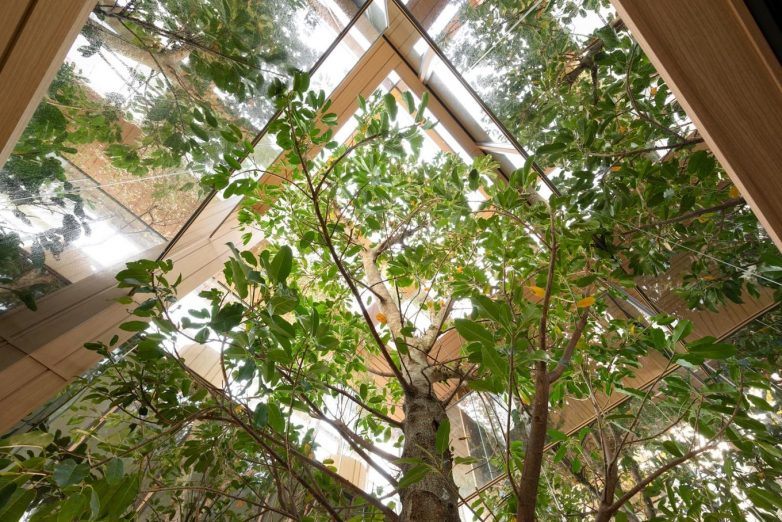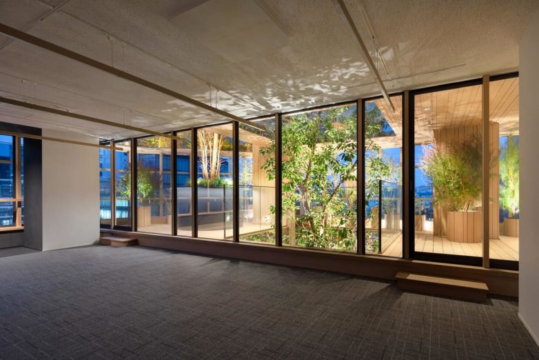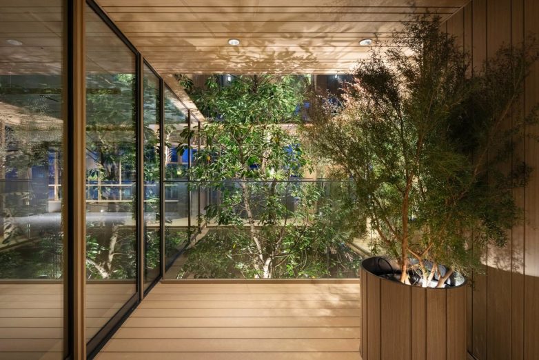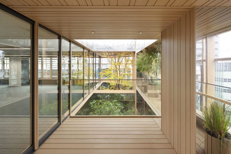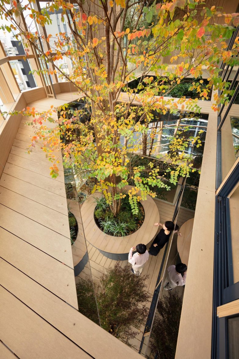 На последних трёх этажах спроектирован сад под открытым небом, названный Sky Forest, где предусмотрены столы и скамейки для отдыха сотрудников. Центральный атриум визуально соединят уровни между собой, позволяя деревьям свободно расти. Решётки из дерева переносятся в интерьеры, которые также были спроектированы студией Nendo. У входа в здание деревянные планки закрывают стены и потолки, а зеркала прорезаны между ними, создавая иллюзию большего пространства. Линейное освещение размещено на деревянных планках.