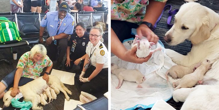 В аэропорту американского города Тампа внезапно начала рожать собака-поводырь Элли, что оказалось полной неожиданностью для ее хозяйки. На помощь Элли пришла бригада скорой помощи и пожарный, дежуривший в аэропорту. Собаку решили никуда не переносить, и 8 щенков родились на глазах у толпы зрителей, снимавших все на телефоны. По закону щенкам можно летать только с 8-недельного возраста, но для собачьего семейства сделали исключение, и молодая мама с хозяйкой и потомством отправилась дальше, в Филадельфию.