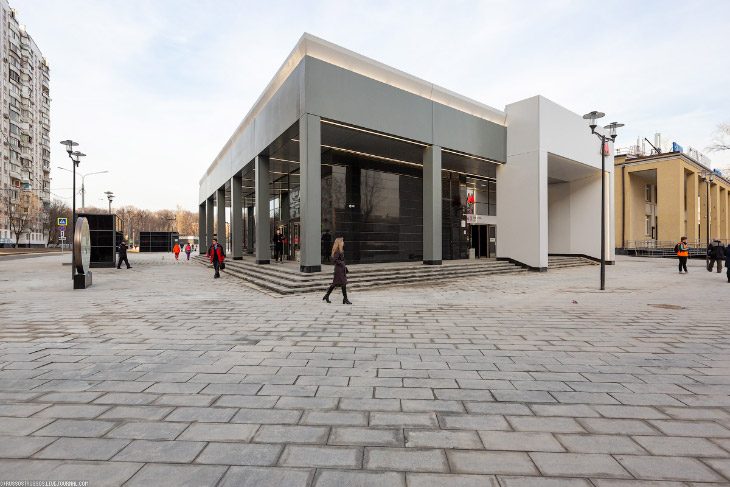 Начнем со станции «Лефортово». Наземный вестибюль прекрасно вписался рядом с кинотеатром Спутник.