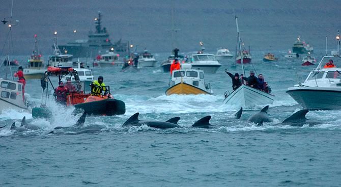Китобойный промысел на Фарерских островах существует, по крайней мере, с десятого века. Есть мнение, что фарерцы таким образом регулируют численность китов, убивая всегда строго определенное количество особей, и если не регулировать, то киты съедят всю рыбу в округе. Ежегодно забивают около 950 гринд (Чёрных дельфинов) и фарерские мужчины часто говорят, что участие в китобойном промысле позволяет им чувствовать себя настоящими фарерцами. Как бы то ни было, зрелище это малоприятное: вода окрашивается в красный цвет, и в эти моменты жители Фарерских островов больше похожи на дикарей, 22 ноября 2011.